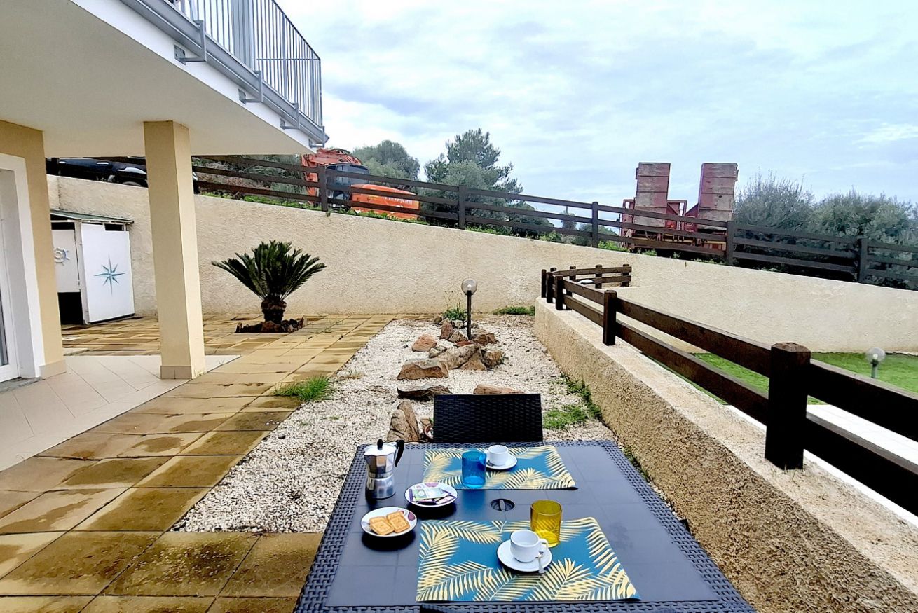 L’ampio spazio esterno privato, finemente arredato con mobili da giardino, è il luogo ideale per colazioni vista mare, momenti di puro relax o aperitivi al tramonto, con lo sguardo che si perde tra il blu della piscina e quello del mare.